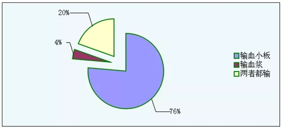選擇我院2013年1月至2015年7月期間臨床醫(yī)生為內(nèi)科、外科、急診、手術(shù)患者中臨床單純輸注血小板和(或)血漿后再次做血栓彈力圖檢測(cè)進(jìn)行比對(duì)且Angel角值正常的患者人數(shù)是2345人(由于討論的是輸注血小板和(或)血漿對(duì)臨床輸血的指導(dǎo)作用,所以要求匯總統(tǒng)計(jì)的患者其Angel角的數(shù)值是正常的,排除了纖維原對(duì)患者凝血功能的干擾)。 臨床單純輸注血小板和(或)血漿后再次做血栓彈力圖檢測(cè)進(jìn)行比對(duì)的2345名患者中有1791名只輸注血小板的患者,占總?cè)藬?shù)人數(shù)的76.38%;有458名同時(shí)輸注血小板和血漿的患者,占總?cè)藬?shù)19.53%;有96名是只輸血漿的患者,占總?cè)藬?shù)的4.09%(圖1表示)。