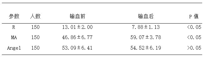 表1 臨床患者輸血前后R值和MA值A(chǔ)ngle角值的比較