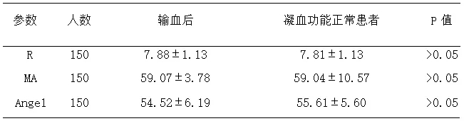表2 臨床輸血患者輸血后和正常患者R值和MA值A(chǔ)ngle角值的比較