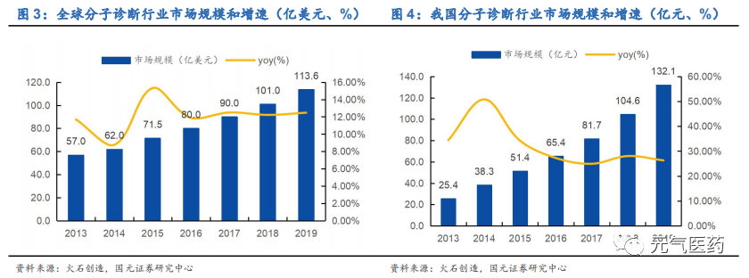 國內(nèi)分子診斷起步較晚,發(fā)展速度高于全球。在精準醫(yī)療、個性化用藥等需求推動下,分子診斷技術(shù)在全球得到飛速發(fā)展,根據(jù)火石創(chuàng)造數(shù)據(jù)顯示,2013-2019 年全球分子診斷市場規(guī)模由 57 億美元增長至 113.6 億美元,年復(fù)合增長率為12.18%,主要市場玩家包括羅氏、雅培、西門子、強生等。國內(nèi)分子診斷雖然起步較晚,但在消費升級、政策扶持以及資本青睞等多重因素推動下,已經(jīng)由產(chǎn)業(yè)導(dǎo)入期步入成長期。2013-2019 年,我國分子診斷市場規(guī)模由 25.4 億元增長至約132.1 億元,年復(fù)合增長率達到 31.63%,雖然僅占全球市場規(guī)模的 16.86%,但是增速約為全球增速的 2.6 倍,主要企業(yè)包括達安基因、凱普生物、華大基因、貝瑞基因、艾德生物等。