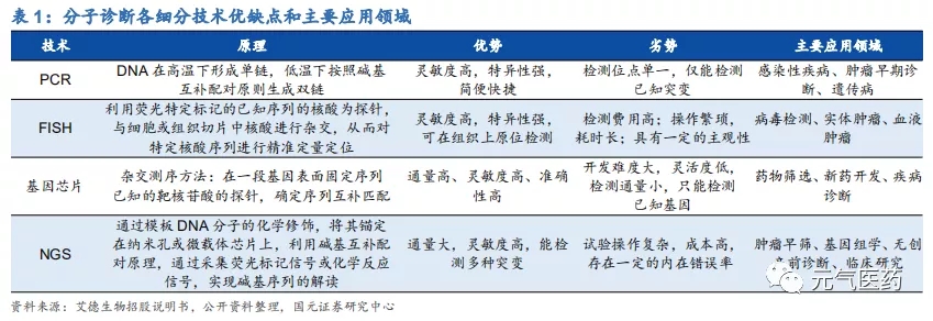 分子診斷領(lǐng)域主要包括 PCR(qPCR 和 dPCR)、二代測序技術(shù)(NGS)、熒光原位雜交(FISH)、基因芯片等, 其中 PCR 是目前應(yīng)用最成熟、市場份額最大的技術(shù)平臺,在國內(nèi)分子診斷中市占率為 40%,在國內(nèi)獲批的分子診斷產(chǎn)品中,基于 PCR 技術(shù)的超過 90%。與雜交技術(shù)和測序技術(shù)相比,PCR 技術(shù)主要優(yōu)勢在于高靈敏度、易于推廣, 主要局限在于檢測位點單一且已知,多重基因聯(lián)合檢測時可涵蓋的基因數(shù)量受限,目前已經(jīng)發(fā)展到第三代數(shù)字 PCR (dPCR),短期內(nèi)仍將是分子診斷主流技術(shù)平臺;測序技術(shù)發(fā)展迅猛,雖然市占率較低但市場增速最快,其中二代測序技術(shù) NGS(高通量測序)是目前測序領(lǐng)域應(yīng)用最廣泛的技術(shù),已經(jīng)成為許多序列變異分析與科研應(yīng)用的主要選擇,但由于實驗操作復(fù)雜、成本高等原因,在臨床應(yīng)用中仍處于起步階段,應(yīng)用前景廣闊。