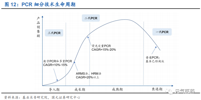 第二代熒光定量 PCR(qPCR)技術(shù):qPCR 在一代定量 PCR 的基礎(chǔ)上引入熒光探針標(biāo)記法從而實現(xiàn)定量檢測,目前發(fā)展最成熟、應(yīng)用最廣泛、臨床普及率高,為現(xiàn)階段主流應(yīng)用平臺,正處于從成長期向成熟期過渡的 階段,市場增速在 20%以上;