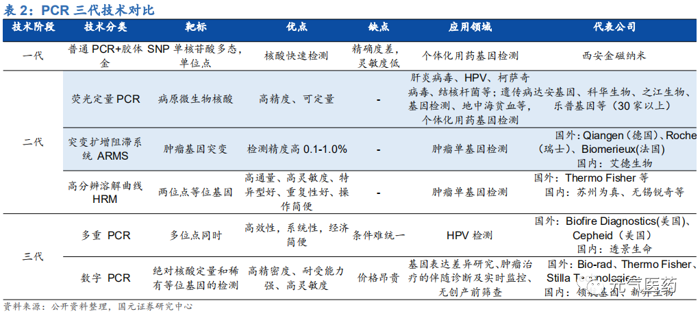 PCR 技術(shù)最大的特點就是靈敏度高、特異性好、及時方便,在基礎(chǔ)研究以及醫(yī)學(xué)診斷、法醫(yī)學(xué)和農(nóng)業(yè)科學(xué)等各大領(lǐng)域應(yīng)用廣泛。在臨床診斷中,PCR 技術(shù)具有諸多優(yōu)勢:靈敏度高,靶細胞檢出率可達 1/100 萬,病毒檢測靈敏度≥ 3RFU,最小細菌檢出率為 3 個,檢測樣本純度要低,僅需 DNA 粗提取;擴增反應(yīng)在 2-4 小時內(nèi)完成,使用簡便、快捷。作為臨床診斷的“金標(biāo)準”技術(shù),PCR 廣泛應(yīng)用于血站核酸檢測、疾控核酸檢測、臨床核酸檢測等領(lǐng)域,其中, 在傳染病診斷和血篩檢測中,PCR 技術(shù)能縮短診斷的“窗口期”并且可以定量對病原體進行檢測,相比于傳統(tǒng)的免疫診斷方式,具有不可替代的優(yōu)勢,基于 PCR 技術(shù)的分子診斷是醫(yī)院對傳染病診斷的“金標(biāo)準”。PCR 經(jīng)過三代技術(shù)更迭,精確度和靈敏度不斷提高。PCR 技術(shù)最早由穆勒于 1985 年發(fā)明,經(jīng)歷了第一代定性 PCR、 第二代定量 PCR 和數(shù)字 PCR 三代技術(shù)迭代,其中第二代定量 PCR 包括熒光定量 PCR(qPCR)以及在其基礎(chǔ)上分 化出來的 ARMS(突變擴增阻滯系統(tǒng))和 HRM(高分辨溶解曲線)。三代技術(shù)的主要差異如下: