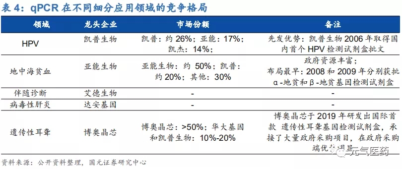 國內(nèi) PCR 行業(yè)競爭激烈,不同細分領(lǐng)域龍頭效應(yīng)顯著。二代 PCR 技術(shù)門檻相對較低,國內(nèi)獲批的 PCR 檢測產(chǎn)品數(shù)量多、競爭激烈,主要企業(yè)包括達安基因、艾德生物、凱普生物、之江生物、碩世生物、透景生物、圣湘生物等。從獲批的 PCR 檢測試劑盒數(shù)量維度看,達安基因擁有 38 種基于 qPCR 技術(shù)的檢測試劑盒取得 NMPA 的批文;從不同細分應(yīng)用領(lǐng)域維度看,各家產(chǎn)品線重合度較高,尤其是優(yōu)生優(yōu)育、性傳播疾病、HPV 檢測等領(lǐng)域競爭激烈,但艾德生物、凱普生物、亞能生物憑借多年在不同細分領(lǐng)域的先發(fā)優(yōu)勢、技術(shù)積累以及渠道優(yōu)勢等分別在伴隨診斷、HPV 檢測、地中海貧血檢測領(lǐng)域處于絕對領(lǐng)先地位,其中凱普生物在 HPV 檢測領(lǐng)域占據(jù) 1/3 市場份額,艾德生物在 PCR 伴隨診斷領(lǐng)域具有絕對領(lǐng)先優(yōu)勢。