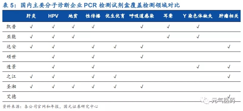 NGS 存在部分技術(shù)瓶頸尚未解決、成本較高、入院困難、醫(yī)保覆蓋范圍有限等諸多難題,對 PCR 市場份額的沖擊較小。從基因檢測數(shù)量看,PCR 能滿足現(xiàn)有檢測需求,NGS 適合高通量檢測需 求;PCR 和 NGS 在應(yīng)用場景是重疊度較低,PCR 和 NGS 在不同細分領(lǐng)域“各領(lǐng)風(fēng)騷”。因此我們認為,短中期來看,PCR 和 NGS 之間是優(yōu)勢互補、相輔相成、共存發(fā)展而并非替代的關(guān)系,目前 PCR 仍將是主流的分子診斷平臺,NGS 是未來發(fā)展的重要趨勢。