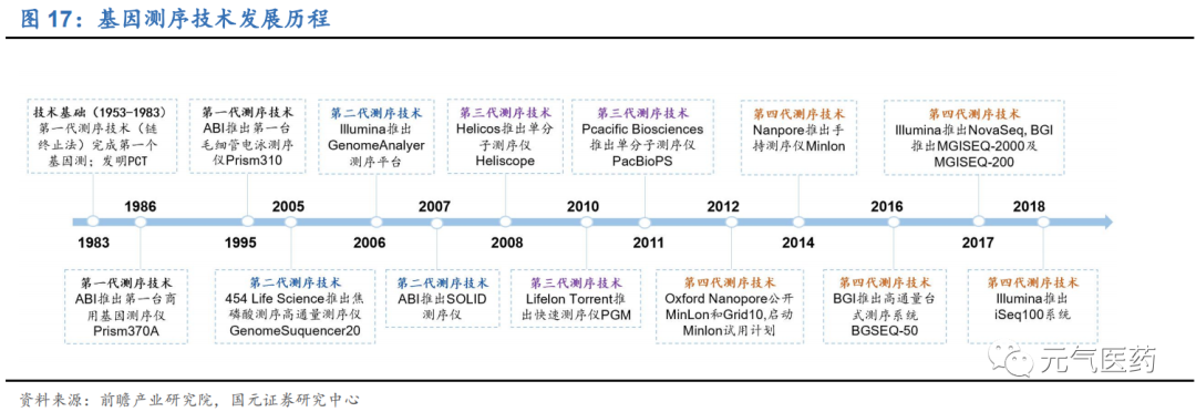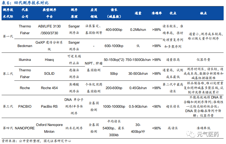 測序技術(shù)更迭速度快,二代高通量測序(NGS)為市場商用主流。從 1977 年第一代 DNA 測序技術(shù)(Sanger 法)發(fā)展至今,測序技術(shù)經(jīng)歷了第二代高通量測序(NGS)、第三代單分子測序技術(shù)和第四代納米孔測序技術(shù)的發(fā)展變 革,各代技術(shù)應(yīng)用領(lǐng)域不盡相同,各有優(yōu)缺點,目前處于三代技術(shù)并存的局面。第一代 Sanger 測序技術(shù)具有測序讀長較長、準確率高的優(yōu)點,但由于通量低、成本高等因素沒有得到大規(guī)模應(yīng)用;二代測序技術(shù)自 2005 年以來快速發(fā)展,憑借高通量、低成本、測序時間端等優(yōu)勢,在全球測序市場中仍占據(jù)主導(dǎo)地位;第三/四代技術(shù)在測序流程、測序時間和讀長上進一步優(yōu)化,在 ctDNA 測序、單細胞測序等也具有明顯優(yōu)勢,是未來發(fā)展趨勢,但目前由于錯誤率較高、分析軟件不夠豐富等原因,商用受到一定限制,未來隨著技術(shù)的改善有望進入成熟應(yīng)用階段。