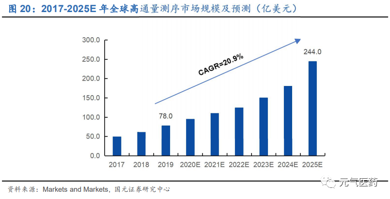 多因素驅(qū)動 NGS 市場高速發(fā)展。隨著 NGS 技術(shù)進步和測序成本的降低、腫瘤醫(yī)生和病人對 NGS 檢測認知不斷完善、測序服務(wù)對象和應(yīng)用細分領(lǐng)域的拓展、企業(yè)間合作的增加,NGS 有望迎來快速發(fā)展。根據(jù)美國Markets and Markets 報告顯示,預(yù)計全球高通量基因測序市場規(guī)模將從 2019 年的 78 億美元增加至 2025 年的 244 億美元, CAGR 為 20.9%。