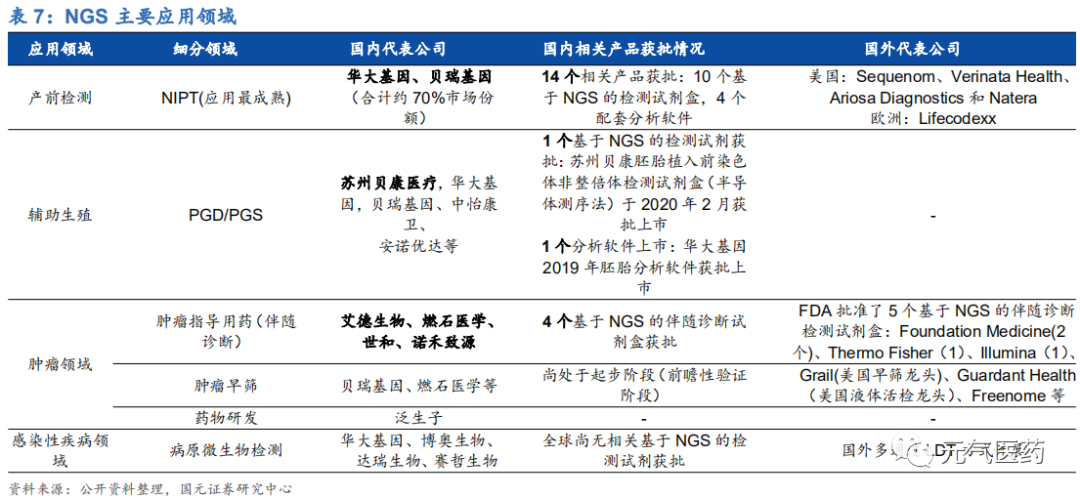 (2) 胚胎植入前遺傳學(xué)診斷/篩查(PGD/PGS):PGD/PGS 是指在輔助生殖過程中,對胚胎進行種植前的活檢和 遺傳學(xué)分析,以選擇無遺傳學(xué)疾病的胚胎植入子宮。相比傳統(tǒng)的 FISH 和 PCR 技術(shù),NGS 最大的優(yōu)點在 于它不僅可以檢測胚胎的非整倍體,還能檢測單基因遺傳疾病,目前該領(lǐng)域仍處于探索階段,國內(nèi)僅有蘇州貝康的胚胎植入前染色體非整倍體檢測試劑盒(半導(dǎo)體測序法)于 2020 年 2 月獲批上市,另外華大基因、中儀康衛(wèi)、貝瑞基因、安諾優(yōu)達等也在積極推進其胚胎植入前檢測產(chǎn)品的上市。PDG/PGS 在輔助生殖領(lǐng)域的應(yīng)用價值越來越明顯,未來隨著測序成本降低和更多產(chǎn)品獲批,市場需求有望持續(xù)擴大,或成為 繼 NIPT 之后 NGS 在生育健康領(lǐng)域新的“藍海”市場。