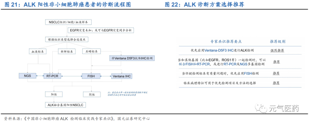 一些特定基因檢測往往需要結(jié)合多個診斷手段,提高檢測準確率。以 ALK 基因檢測為例,根據(jù)《中國非小細胞肺癌 ALK 檢測臨床實踐專家共識》,Ventana-D5F3 IHC、FISH、RT-PCR、NGS 四種技術(shù)均可用于 ALK 基因融合檢測, 但沒有一種方法可以保證 100%準確率,在檢測時需要根據(jù)具體情況結(jié)合多個技術(shù)以避免出現(xiàn)漏檢、錯檢的問題。