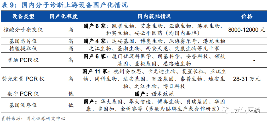 上游診斷試劑和儀器供應(yīng)商:國內(nèi)分子診斷試劑發(fā)展較為迅速,基本已經(jīng)實現(xiàn)國產(chǎn)化;診斷儀器領(lǐng)域,國產(chǎn)儀 器占比較小,其中核酸提取儀、普通 PCR 儀、基因芯片儀、分子雜交儀等技術(shù)相對容易攻破的中端儀器領(lǐng)域 基本已經(jīng)實現(xiàn)國產(chǎn)替代化,而包括數(shù)字 PCR 儀和基因測序儀在內(nèi)的高端儀器主要由外資品牌主導(dǎo),技術(shù)壁壘 極高,國產(chǎn)品牌正處于起步階段。數(shù)字 PCR 儀目前市場上基本被 Bio-Rad、Thermo Fisher、Stilla Technomogies 國際大品牌所占有。基因測序儀領(lǐng)域基本被 Illumina、Thermo Fisher、Rocher 等外資品牌 壟斷,目前國內(nèi)僅有華大基因等個別優(yōu)秀國產(chǎn)品牌實現(xiàn)了自主研發(fā)生產(chǎn)的基因測序儀,大多數(shù)企業(yè)是通過 OEM (貼牌)和合作研發(fā)的形式完善產(chǎn)業(yè)鏈布局。