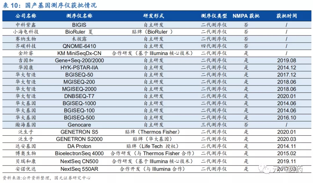 從國產(chǎn)替代進程看,目前國內(nèi)在產(chǎn)業(yè)鏈上游的測序儀開發(fā)商仍處于弱勢競爭地位,雖然華大基因和貝瑞基因擁有自主研發(fā)生產(chǎn)的二代測序儀,但大多數(shù)企業(yè)還是通過貼牌貨合作的方式引用進口 PCR 和基因測序儀,議價能力弱。