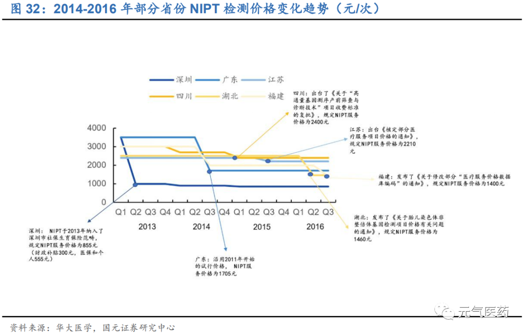 醫(yī)保支付覆蓋+孕婦檢測意識的提升雙輪驅(qū)動 NIPT 市場擴容:隨著 NIPT 進入技術(shù)成熟階段,檢測費用有所 下調(diào),同時醫(yī)保逐步覆蓋,較大程度上有助于提升可及性。2013 年,深圳市率先將 NIPT 檢測項目納入醫(yī)保 范疇,極大提高了 NIPT 檢測的認知度和滲透率。從 2016 年數(shù)據(jù)來看,非高齡孕婦中 NIPT 的滲透率僅有 3%, 仍有較大提升空間。目前,僅有 10 個省份將 NIPT 納入醫(yī)保。