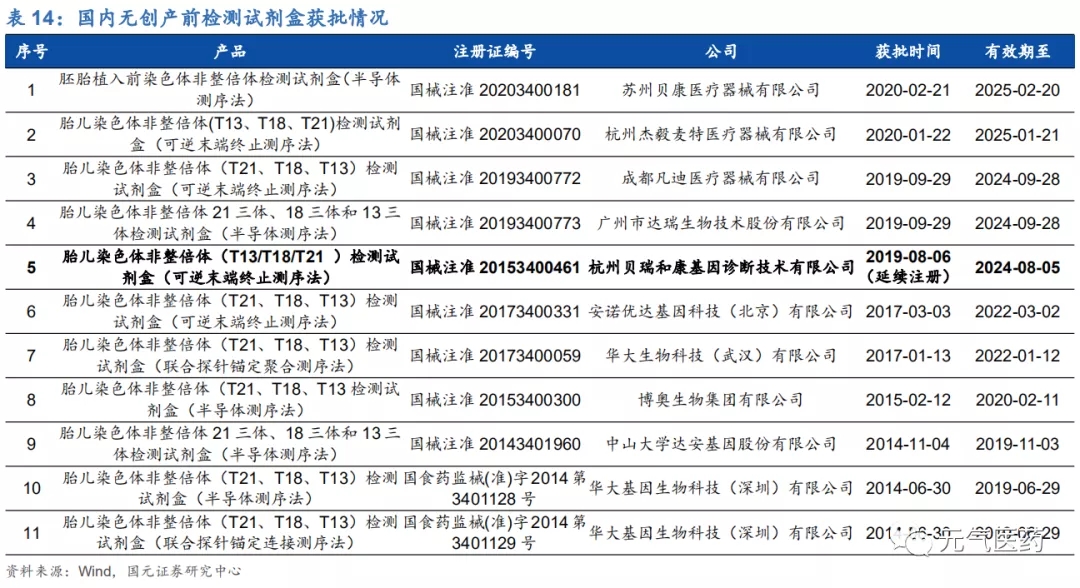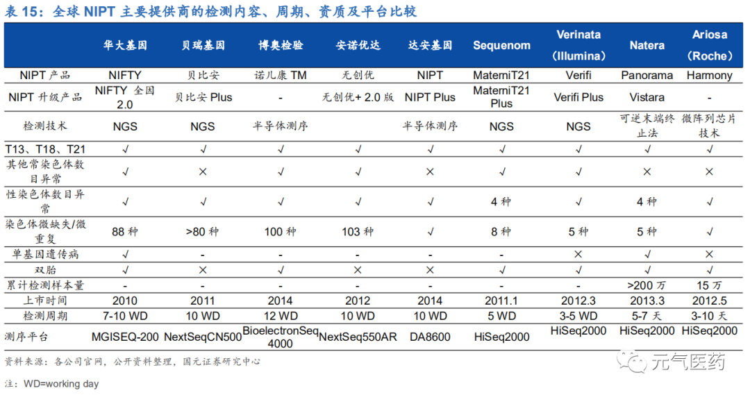 (1)無創(chuàng)產(chǎn)前診斷(NIPT):NIPT 是 NGS 應(yīng)用成熟的典范領(lǐng)域,相比傳統(tǒng)的血清學(xué)唐篩,NIPT 具有檢出率高、 流產(chǎn)風(fēng)險低、檢測周期短、操作簡便等諸多優(yōu)勢,市場廣闊而成熟。NIPT 檢測范圍隨著技術(shù)的發(fā)展不斷擴大, 貝瑞基因、華大基因等龍頭企業(yè)推出的 NIPT Plus 升級產(chǎn)品將檢測范圍拓展至更多的染色體數(shù)量或結(jié)構(gòu)異常、 甚至單基因遺傳病,更好地契合不同的臨床需求。隨著國內(nèi)對 NIPT 監(jiān)管從無序到有序、越來越多省份將 NIPT 納入醫(yī)保或降低價格,NIPT 開始進入大眾價時代。國內(nèi)貝瑞基因和華大基因憑借先發(fā)優(yōu)勢和技術(shù)優(yōu)勢寡頭壟斷,市場競爭格局已趨于穩(wěn)定。