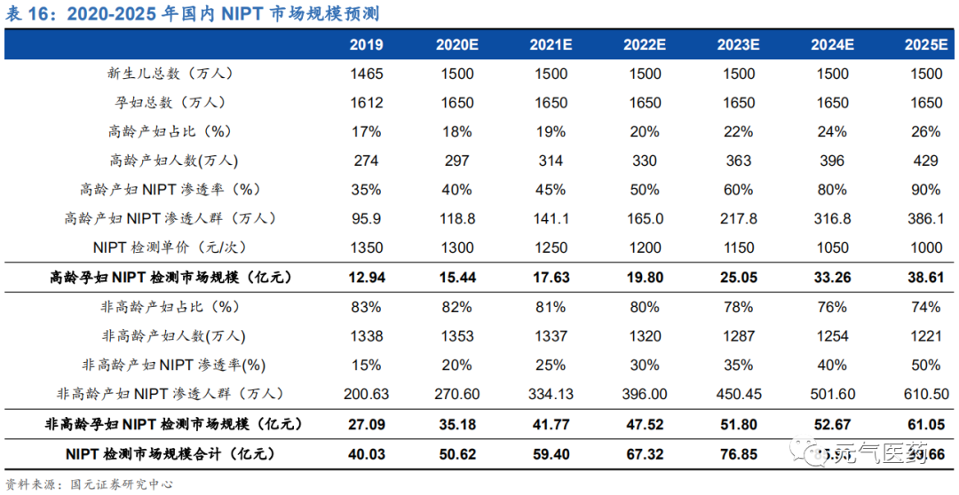 因此,根據(jù)我們測算,目前 NIPT 在高齡產(chǎn)婦中滲透率為 35%,非高齡產(chǎn)婦中滲透率為 15%,全市場規(guī)模為 40.03 億。預(yù)計隨著醫(yī)保覆蓋提升、產(chǎn)品升級換代,2025 年我國 NIPT 市場規(guī)模有望達到約 100 億元,仍有超過一倍提升空間。