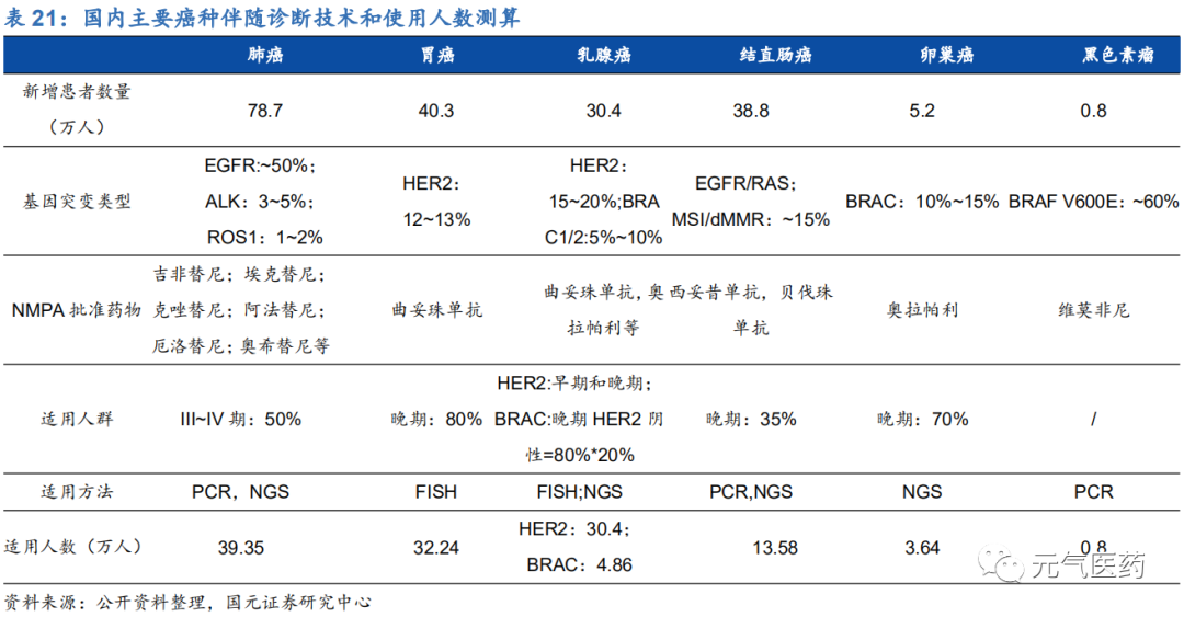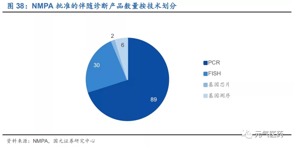 (2)腫瘤伴隨診斷:伴隨診斷(CDx)是靶向用藥、實現(xiàn)精準治療的關(guān)鍵因素。目前仍以 PCR 為主,F(xiàn)DA 批準的 39 個 CDx 產(chǎn)品中有 15 個是基于 PCR,NGS 是未來方向,2018 年燃石醫(yī)學(xué)、諾禾致源、世和基因、艾德生 物四家企業(yè)的腫瘤 NGS 檢測試劑盒先后獲批,標(biāo)志著國產(chǎn) NGS 伴隨診斷產(chǎn)品開始邁入市場化階段,PCR 和 NGS 將齊頭并進、共同發(fā)展。目前伴隨診斷滲透率不足 50%,根據(jù)我們測算,肺癌、胃癌等 6 個癌種的 PCR+NGS 伴隨診斷市場規(guī)模合計約 39 億元,隨著大 Panel 和 NGS 產(chǎn)品滲透率提升,以及更多靶點和相應(yīng)靶向藥物的發(fā)現(xiàn),伴隨診斷市場有望進一步擴容。國內(nèi)艾德生物憑借多年的技術(shù)優(yōu)勢和產(chǎn)品布局成為伴隨診斷行業(yè)領(lǐng)跑者,產(chǎn)品管線豐富,核心競爭力強,渠道和品牌優(yōu)勢明顯,PCR 領(lǐng)域基本實現(xiàn)進口替代;燃石醫(yī)學(xué)是國內(nèi)腫瘤 NGS 伴隨診斷領(lǐng)域龍頭,憑借核心技術(shù)優(yōu)勢于 2018 年拿下國產(chǎn)“腫瘤 NGS 試劑盒第一證”,目前 在腫瘤 NGS 伴隨診斷市占率第一。