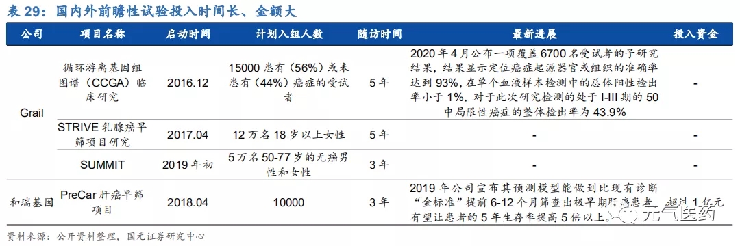 (3)腫瘤早篩:現(xiàn)有早篩手段多具有一定局限性,多數(shù)癌種尚無有效監(jiān)測手段,我國早篩“藍海”市場理論市場空間大,巨大潛在需求吸引國內(nèi)外企業(yè)加速布局并搶占市場份額。從全球企業(yè)布局來看,全球頭部公司多處于產(chǎn)品研發(fā)優(yōu)化及驗證階段,Grail、Freenome 和 Thrive 等高科技公司走在前列。國內(nèi)企業(yè)尚處于起步階段,早篩的臨床驗證需要較高的研發(fā)投入,其中貝瑞基因和燃石醫(yī)學(xué)等企業(yè)進度領(lǐng)先。貝瑞基因的 PreCar 肝癌早篩項目預(yù)計 2020 年8月將以 LTD 的形式落地,預(yù)計有望成為早篩成功標(biāo)桿。燃石醫(yī)學(xué)主要在泛癌種早篩方向發(fā)力,包括肺癌、腸癌和肝癌三種,基于深度甲基化測序與機器學(xué)習(xí)技術(shù),公司開展了國內(nèi)迄今為止最大規(guī)模的前瞻性、泛癌種早檢研究,預(yù)期納入 1.4 萬受試者,并計劃在三年內(nèi)完成早篩產(chǎn)品的技術(shù)優(yōu)化及臨床驗證。在政策、技術(shù)和市場需求的驅(qū)動下,國內(nèi)早篩市場有望迎來蓬勃發(fā)展。