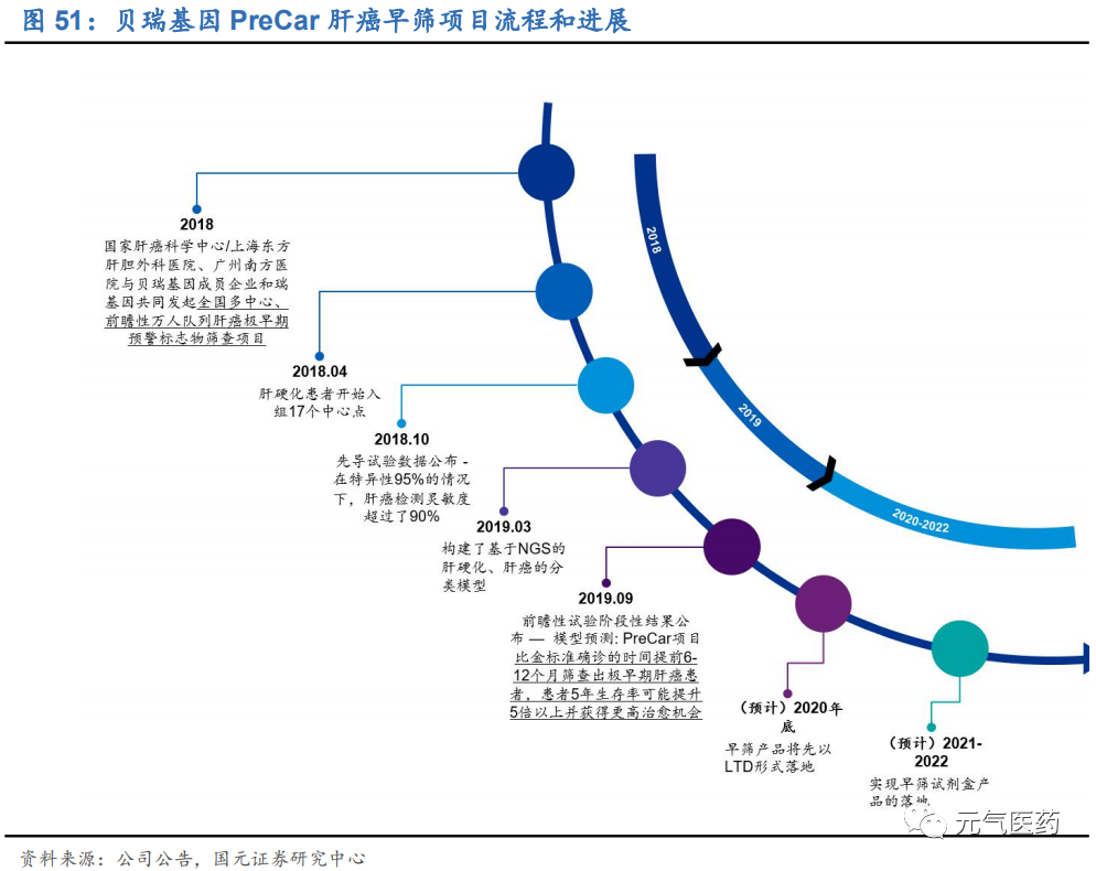 千億級潛在市場吸引國內(nèi)外企業(yè)加速布局早篩業(yè)務(wù),而我們認為能夠率先走出來的產(chǎn)品需要精準抓住需求點及診療路徑。貝瑞基因 PreCar 肝癌早篩項目走在國內(nèi)外研發(fā)前列,經(jīng)過多年的高研發(fā)投入和大規(guī)模前瞻性驗證實驗,其早篩產(chǎn)品即將步入收獲期,將于 2020 年8月以 LTD(第三方檢測服務(wù))的形式落地。