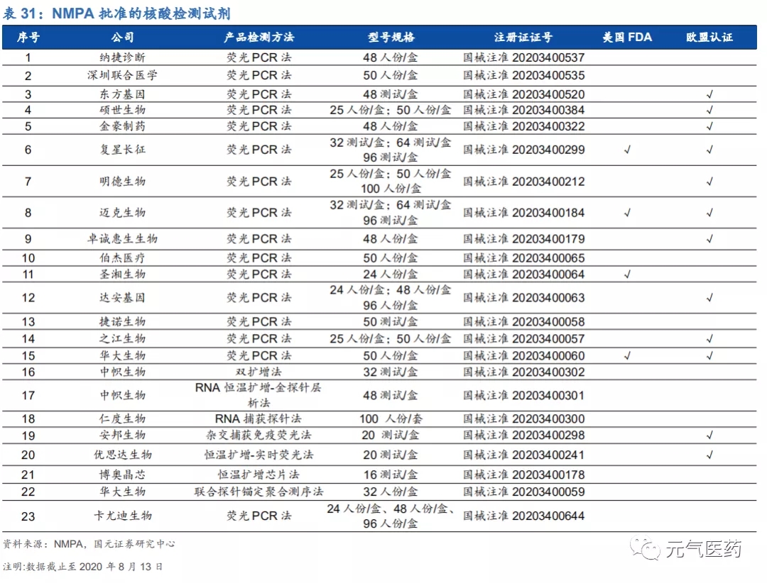 公司新冠檢測試劑遠銷海外,國內(nèi)加快新冠核酸檢測實驗室建設(shè)或利好公司核酸檢測服務(wù)。在新冠疫情爆發(fā)后,早 在 2020 年 2 月 3 日公司便完成了新型冠狀病毒(2019-nCoV)核酸檢測試劑的開發(fā),并于今年 3-4 月先后獲得歐盟 CE 認證與巴西 ANVISA 認證,目前公司新冠檢測試劑盒已經(jīng)出口至全球 40 多個國家。6 月 15 日,凱普生物研發(fā) 的新型冠狀病毒 2019-nCoV 核酸檢測試劑盒(熒光 PCR 法)正式列入 WHO 應(yīng)急使用清單,在當(dāng)前全球嚴峻的疫情形勢下,該產(chǎn)品的海外需求或?qū)⑦M一步擴大。同時,新冠疫情極大推動了核酸檢測市場的發(fā)展,國家國家衛(wèi)健委 發(fā)布的《關(guān)于加快推進新冠病毒核酸檢測的實施意見》中強調(diào)所有二級以上醫(yī)院加快核酸實驗室建設(shè),凱普作為國內(nèi)核酸檢測領(lǐng)先企業(yè),憑借產(chǎn)品線豐富、專業(yè)銷售團隊、渠道下沉深度等優(yōu)勢,將在下一輪核酸檢測市場快速發(fā)展中受益。