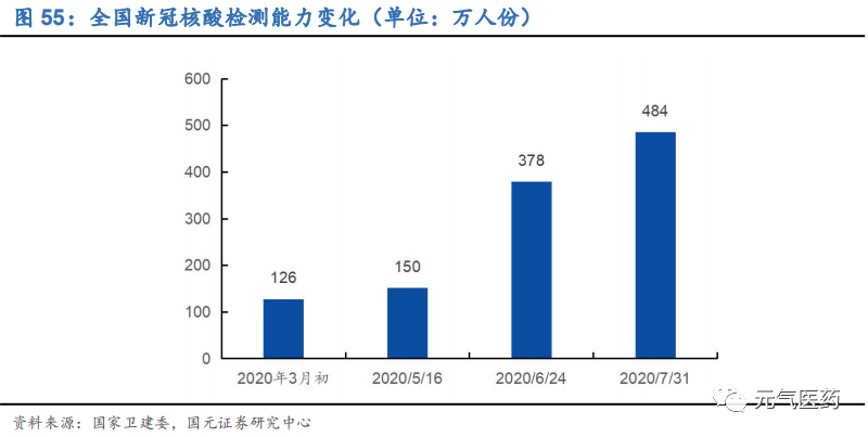 (4)傳染病檢測(新冠檢測+血液篩查):2020 年疫情期間,新冠核酸檢測試劑成為遏制疫情傳播的有力手段,核酸檢測是確診新冠肺炎的“金標(biāo)準”。隨著海內(nèi)外疫情先后蔓延,檢測試劑需求激增,大規(guī)模篩查已成常態(tài)化,國家先后啟動了試劑集采、鼓勵各地二級以上醫(yī)院建設(shè) PCR 實驗室等政策,檢測成本、試劑日產(chǎn)能、日平均檢測量均有了大幅提升,截止 2020 年 7 月底,全國累計核酸檢測量已達 1.6 億人份,核酸檢測試劑周產(chǎn)能達 到 4648 萬人份,充分保障了國內(nèi)核酸檢測常態(tài)化需求。新冠檢測市場規(guī)模較大,市場競爭激烈,集采中以價換量、保證產(chǎn)品質(zhì)量以及拿到海外出口批文將成為國內(nèi)相關(guān)企業(yè)業(yè)績增厚的關(guān)鍵因素,預(yù)計 2020 年下半年甚至 2021 年,邁克生物、之江生物、達安基因等核酸檢測試劑供應(yīng)商以及迪安診斷、金域醫(yī)學(xué)等第三方檢測實驗室將持續(xù)受益。血液篩查主要應(yīng)用于血站和漿站,我們預(yù)計2020-2022 年血液核酸檢測市場規(guī)模將穩(wěn)定在 26 億元左右。從競爭格局看,國內(nèi)血篩檢測試劑銷售以政府招標(biāo)為主,各家產(chǎn)品同質(zhì)程度高,因此渠道優(yōu)勢、成本優(yōu)勢、儀器投放能力將成為國內(nèi)廠商中標(biāo)的主要因素,科華生物、達安生物、上海浩源等老牌國產(chǎn)企業(yè)以及羅氏、諾華等進口企業(yè)或持續(xù)受益。