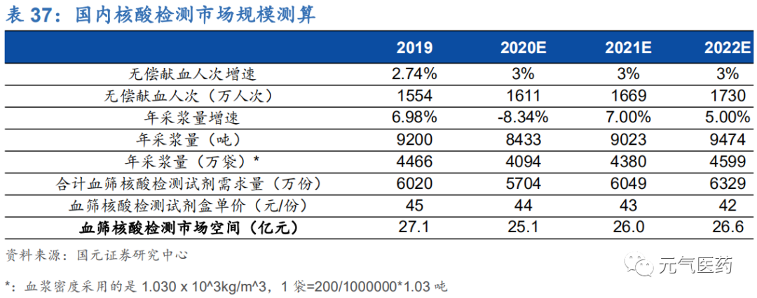 考慮到疫情影響以及國內(nèi)漿站新批難度較大,疊加核酸檢測試劑盒成本逐年降低的趨勢,未來血液核酸檢測市場增 速放緩,天花板可見,我們預(yù)計 2020-2022 年血液核酸檢測市場規(guī)模將穩(wěn)定在 25-27 億元之間。