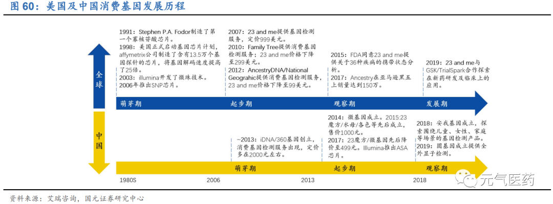 借鑒美國發(fā)展經(jīng)驗,推動消費基因檢測市場提早進入發(fā)展期。消費級基因檢測市場的發(fā)展得益于基因芯片技術(shù)的成熟,1991年全球第一款基因芯片在美國誕生,此后10年內(nèi),隨著 Affymetrix、Illumina、Agilent 等公司不斷提 升芯片種類、檢測通量、準確度與效率,消費基因檢測服務(wù)價格不斷下降,帶動更多企業(yè)進入消費基因檢測領(lǐng)域, 市場開始慢慢進入發(fā)展期,2019 年美國消費基因檢測用戶規(guī)模達到2650 萬人,滲透率達到 8.1%,成為全球消費級基因檢測市場發(fā)展最快的國家。國內(nèi)消費級基因檢測起步較晚,雖然早在 2008 年就出現(xiàn)了萌芽,但過高的價格促使產(chǎn)品滯銷。直到2015 年微基因、23 魔方等多家基于芯片技術(shù)的基因檢測公司的產(chǎn)品問世,國內(nèi)消費級基因檢測行業(yè)才算起步。