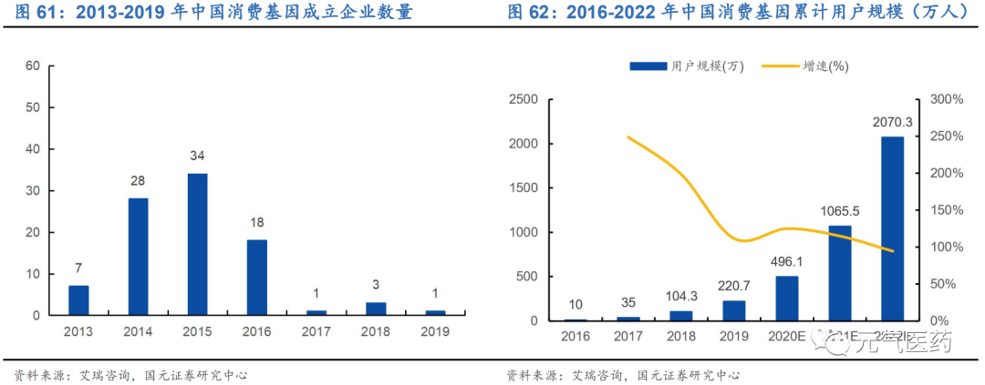 市場格局尚未成型,市場參與者眾多且小而散。雖然目前消費級基因檢測市場規(guī)模較小,但行業(yè)競爭較為激烈,相比臨床級基因檢測,消費級基因檢測在技術(shù)、合規(guī)性等方面進入壁壘較低,市場玩家較多。據(jù)不完全統(tǒng)計,國內(nèi)涉足消費基因檢測業(yè)務(wù)的企業(yè)數(shù)量約為 130 家,其中 2014-2016 年成立的就有 90 家,消費者認知度較高的品牌主要 有微基因、23 魔方、安我基因三家,占據(jù)絕大部分市場份額。此外,體檢中心也是國內(nèi)布局消費級基因檢測企業(yè)快速滲透的途徑之一,比如美因基因利用民營體檢機構(gòu)美年健康的渠道提供大眾檢測服務(wù),目前總數(shù)據(jù)量從 2017 年的 50 萬份提升至 600 萬份。在行業(yè)發(fā)展初期,企業(yè)間用戶規(guī)模差異不大,競爭格局極易改變,未來用戶規(guī)模的增加將 是消費級基因檢測市場參與者重要指標(biāo)之一。