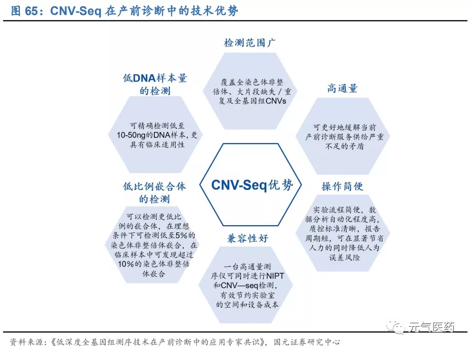 CNV-Seq 是推薦一線染色體畸變產(chǎn)前診斷技術(shù)。公司自主研發(fā)的“科諾安”染色體拷貝數(shù)變異檢測(Copy Number Variation Sequencing,CNV-Seq)主要用于產(chǎn)前診斷和流產(chǎn)物遺傳學(xué)病因檢測領(lǐng)域,在《低深度全基因組測序技術(shù)在產(chǎn)前診斷中的應(yīng)用專家共識》中被推薦作為一線產(chǎn)前診斷技術(shù)對可能存在胎兒染色體異常的孕婦進行產(chǎn)前診斷,可檢測外周血、絨毛、羊水、臍帶、流產(chǎn)物等多種類型樣本,一次性分析 23 對常染色體非整倍體以及>100kb 的染 色體拷貝數(shù)變異。傳統(tǒng)染色體畸變檢測技術(shù)-核型分析和染色體微陣列分析(CMA)分別存在周期長、分辨率低和通 量低、成本高的缺點,相比之下 CNV-Seq 技術(shù)具有檢測范圍廣、高通量、操作簡便、兼容性好、適合低比例嵌合體的檢測和所需 DNA 樣本量低等優(yōu)勢。