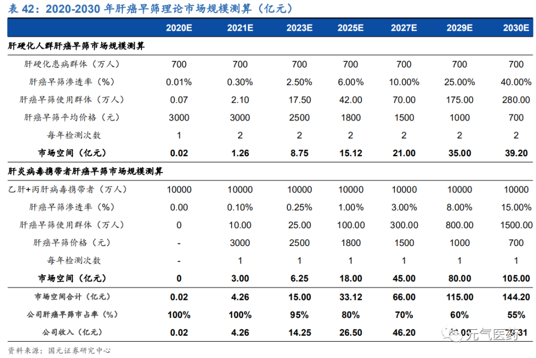 (3)檢測單價:目前市場上已知泛生子肝癌早篩檢測服務(wù)終端單價為 5000 元/次,假設(shè) 2021 年公司肝癌早篩服務(wù)落地后出廠價約為 3000 元/次,隨著早篩成本降低、后續(xù)競品的出現(xiàn),肝癌早篩出廠價逐年下降至 2030 年降至 700元/次;