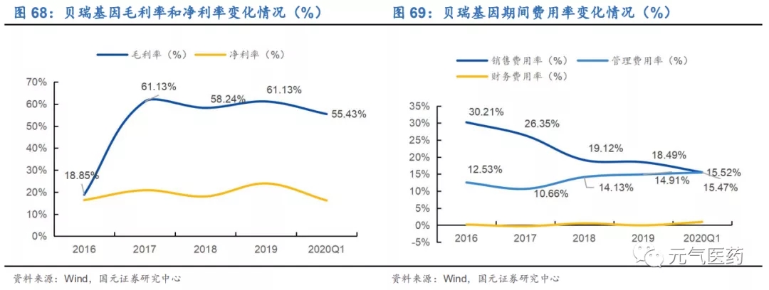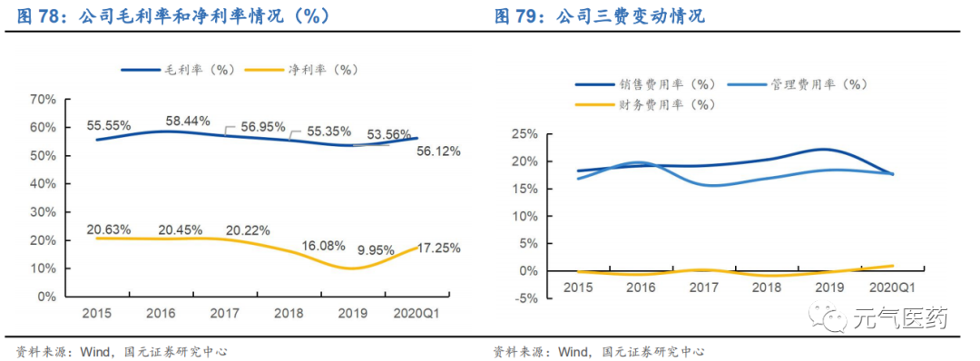 毛利率略有下滑但仍維持較高水平,三費出現(xiàn)小幅波動。2017-2019 年公司毛利率始終維持在 60%左右的水平, 2020Q1 受疫情影響,銷售毛利率為 55.43%,同比下降 0.83%。銷售費用率呈現(xiàn)逐年下降趨勢,2020Q1 為 15.52%, 同比下降 0.2pct,管理費用(含研發(fā)費用)為 15.47%,同比增加 3.46pct,主要是疫情期間公司在新冠病毒檢測及 三代測序試劑盒的研發(fā)投入增加;財務(wù)費用率為 0.95%,同比增加 1.21pct,主要系支付銀行貸款利息所致。