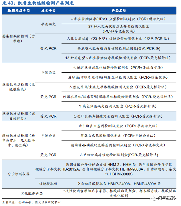 凱普生物是國內(nèi)領(lǐng)先的分子診斷產(chǎn)品及服務(wù)提供商,在生殖感染、出生缺陷等感染性、遺傳性疾病領(lǐng)域已開發(fā)系列核酸檢測試劑,廣泛應(yīng)用于醫(yī)院臨床診斷、大規(guī)模人口篩查,其中 HPV(人乳頭瘤病毒)檢測市占率第一,約占 1/3 市場份額,地貧、耳聾、STD(性傳播疾病)等檢測市占率均在前三。公司擁有兩大產(chǎn)品開發(fā)技術(shù)平臺—擁有自主知識產(chǎn)權(quán)的導(dǎo)流雜交技術(shù)平臺和 PCR 熒光技術(shù)平臺,每年研發(fā)支出 5000 萬以上,在研項目近 60 個,其中 3 個處于臨床階段的產(chǎn)品,4 個處于注冊申報階段的產(chǎn)品,每年推出 10 款左右新品,形成產(chǎn)品集群。經(jīng)過多年的技術(shù)積累 和品牌建設(shè),公司已發(fā)展成為國內(nèi)分子診斷領(lǐng)域領(lǐng)軍企業(yè)之一。除了核酸檢測產(chǎn)品的研發(fā),公司向下游產(chǎn)業(yè)鏈延伸, 重點拓展第三方醫(yī)學(xué)檢驗服務(wù),打造了“核酸檢測產(chǎn)品+分子診斷服務(wù)”一體化經(jīng)營模式,依托醫(yī)學(xué)檢驗服務(wù)領(lǐng)域的業(yè)務(wù)拓展進一步推動公司核酸檢測試劑業(yè)務(wù)的增長,協(xié)同效應(yīng)明顯。