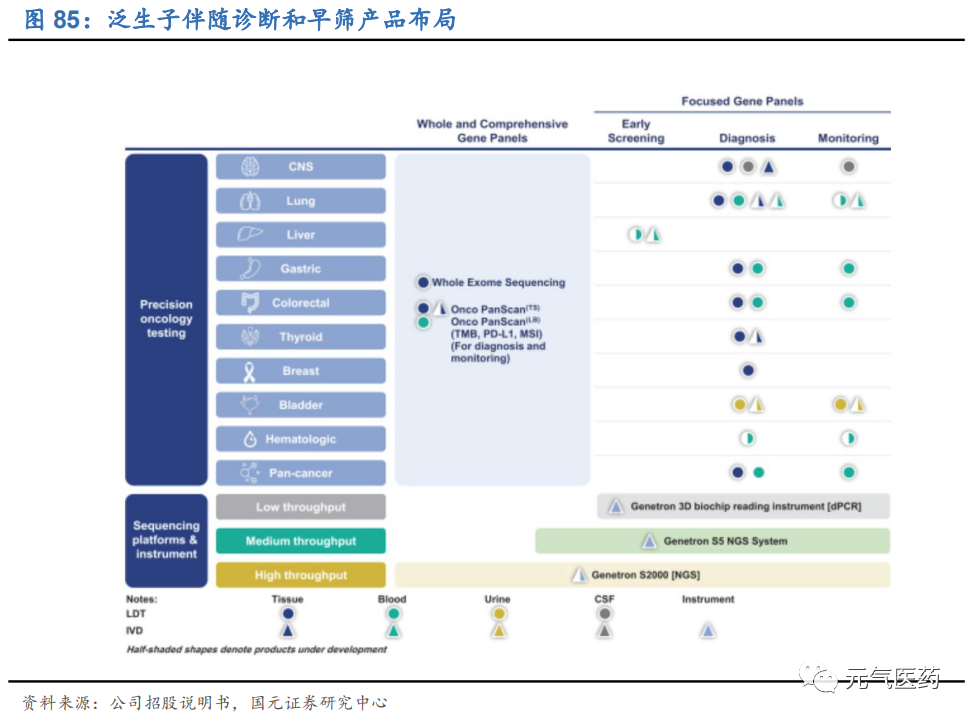 公司通過 LDT 服務(wù)和 IVD 產(chǎn)品提供全面的診斷和監(jiān)控服務(wù)和產(chǎn)品。根據(jù) Frost&Sullivan 數(shù)據(jù)顯示,在 2019 年基于 NGS 的 LDT 收入衡量中,公司在消化道癌和腦癌領(lǐng)域的市場份額領(lǐng)先行業(yè),在肺癌領(lǐng)域也位居前三。在 NMPA 批 準產(chǎn)品數(shù)量上,公司共有 7 款 IVD 產(chǎn)品,在國內(nèi)位居前列,已獲批的產(chǎn)品涵蓋 NGS、dPCR 和 qPCR 三大技術(shù)平臺:中通量 NGS 平臺 Genetron S5、高通量 NGS 平臺 Genetron S2000、肺癌 8 基因檢測試劑盒、神經(jīng)膠質(zhì)瘤的 IDH1 和 TERT 基因檢測試劑盒,以及 Genetron 3D 生物芯片閱讀儀等。公司綜合診斷產(chǎn)品和服務(wù)涵蓋國內(nèi)十大主要癌種 中的八種,截止 2020 年 4 月 30 日,公司已經(jīng)完成了 5 萬余次 LTD 診斷檢測。
