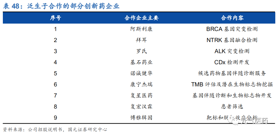 公司已經(jīng)與阿斯利康、拜耳、羅氏等 26 家知名生物制藥公司合作,是國內(nèi) NGS 癌癥診斷和檢測公司合作生物制藥公司數(shù)量最多的企業(yè),能夠提供針對分子靶向療法和免疫療法的生物標(biāo)志物評估、臨床試驗入組、伴隨診斷開發(fā), 以及藥品聯(lián)合營銷批準等定制服務(wù)和產(chǎn)品來滿足不同需求。前 FDA 資深專家胡云富博士的加入,將進一步強化公司 在該領(lǐng)域的綜合實力。